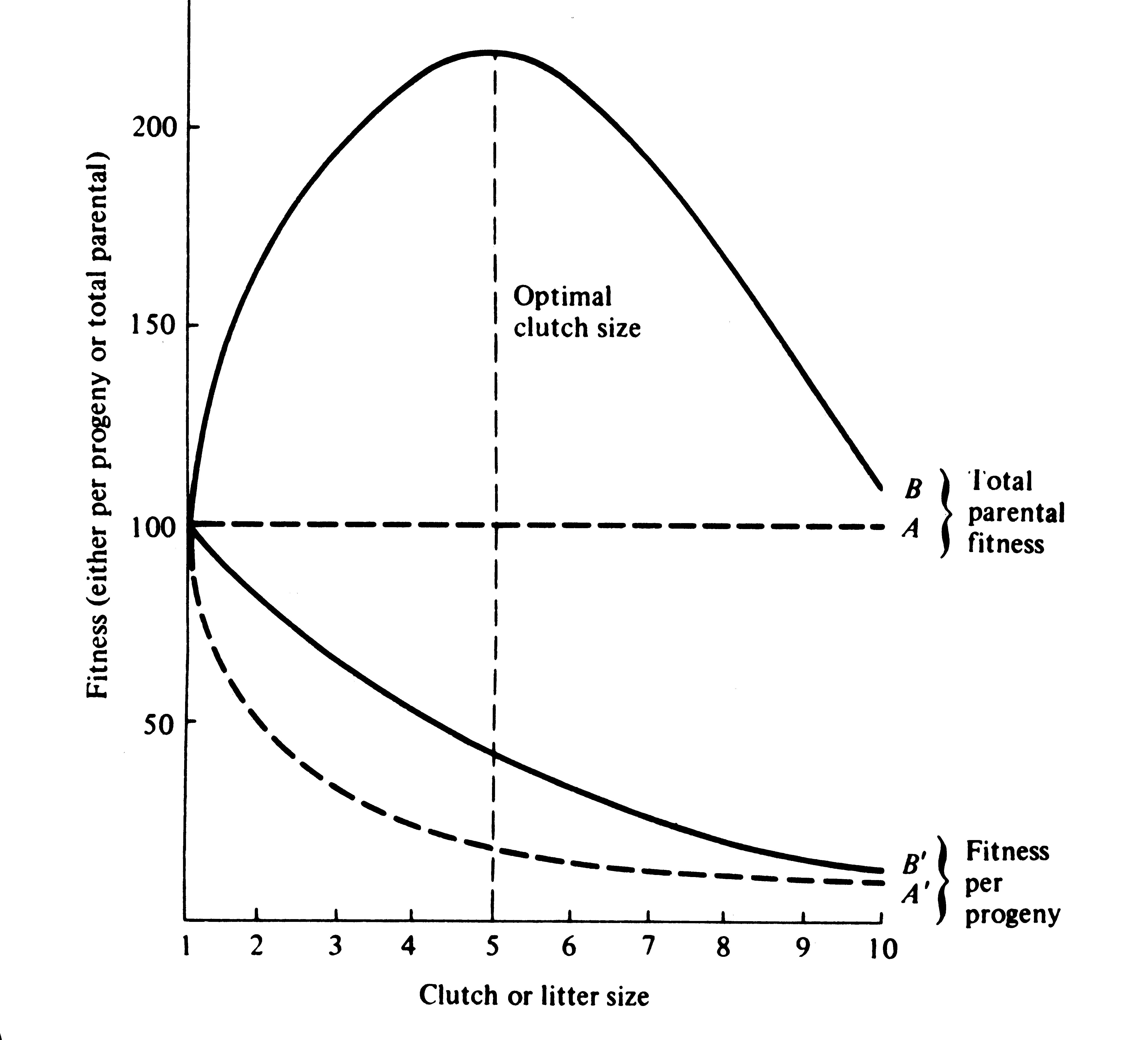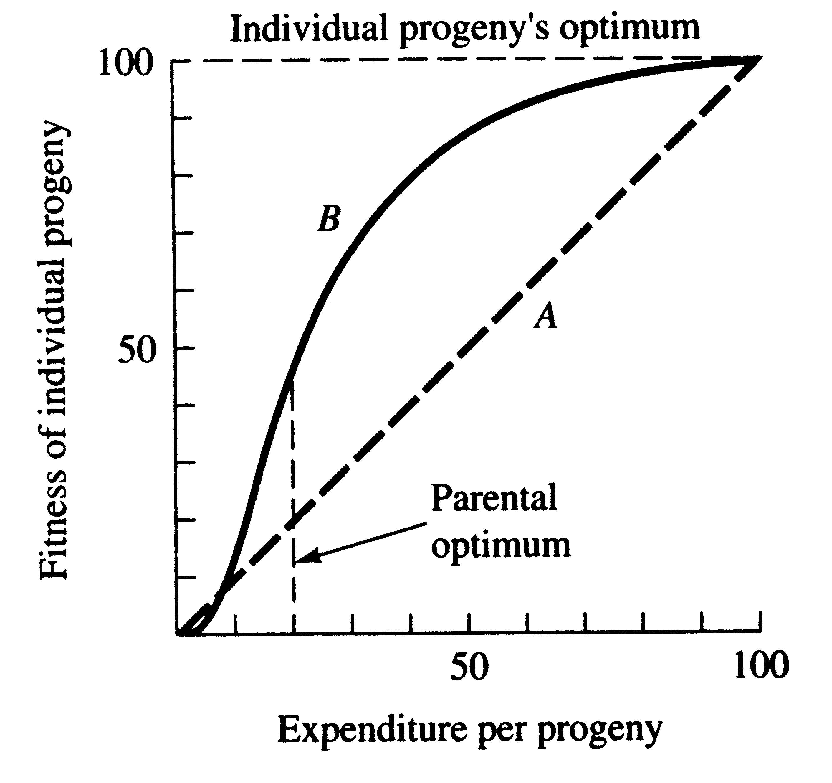 A simple graphical model illustrates this fundamental tradeoff between quantity and quality of offspring (Figures). In the unlikely event that progeny fitness increases linearly with parental expenditure (dashed line A in left Figure), fitness of individual progeny decreases with increased clutch or litter size (the lowermost dashed curve A in right Figure). However, because parental fitness (the total of the fitnesses of all progeny produced) is flat, no optimal clutch size exists from a parental viewpoint (upper dashed line A in right Figure). Gains in progeny fitness per unit of parental investment are likely to be greater at lower expenditures per progeny than at higher ones because the proportional increase per unit of allocation is greater at low levels of investment; curves level off at higher expenditures due to the law of diminishing returns. If the biologically plausible assumption is made that progeny fitness increases sigmoidally with parental investment (curve B in left Figure), there is an optimal parental clutch size (peak of uppermost curve B in right Figure). In this hypothetical example, parents that allocate only 20 percent of their reproductive effort to each of five offspring gain a higher total return on their investment than parents opting for any other clutch size (right Figure). Such curves have been demonstrated for starlings and swifts (Lack 1954) Although such a tactic is optimal for parents, it is not the optimum for individual offspring, which would achieve maximal fitness when parents invest everything in a single offspring. Hence, a "parent-offspring conflict" exists (Trivers 1974). The exact shape of the curve relating progeny fitness to parental expenditure in any real organism is influenced by a virtual plethora of environmental variables, including length of life, body size, survivorship of adults and juveniles, population density, and spatial and temporal patterns of resource availability. The competitive environment of immatures is likely to be of particular importance because larger, better-endowed offspring should usually enjoy higher survivorship and generally be better competitors than smaller ones.